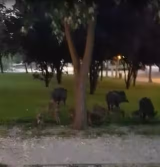 En un vídeo grabado por los vigilantes durante una ronda a primera hora de la mañana por el campus se ve a unos 15 jabalíes, tres adultos y una docena de crías, caminando tanto por el césped como por las vías asfaltadas del recinto universitario.