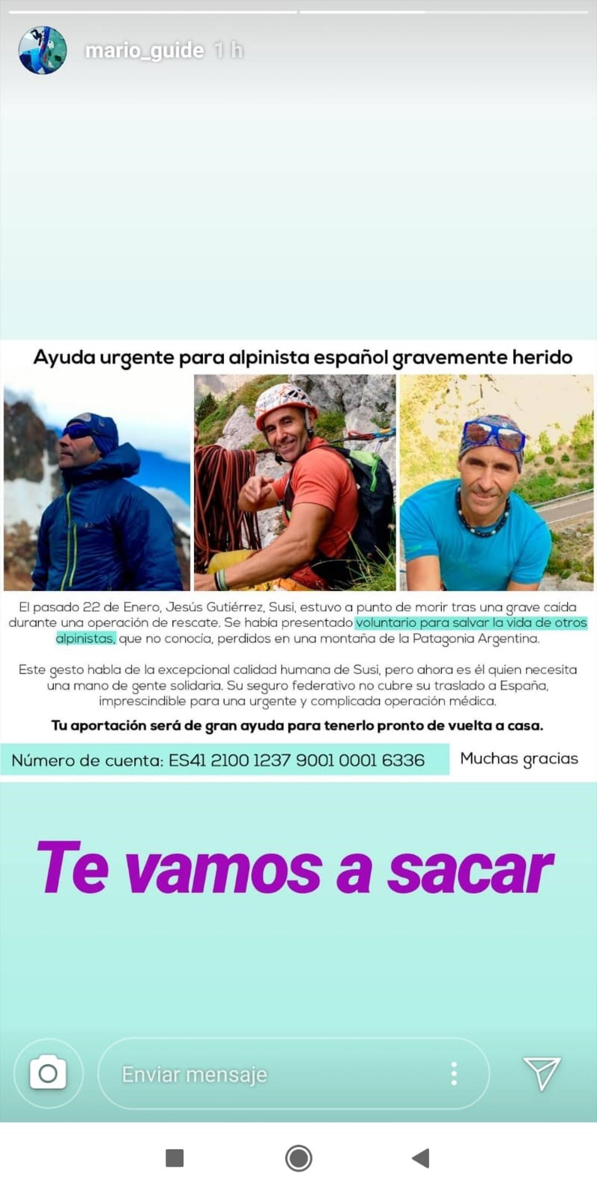 "Aunque Susi (que es como se conoce al alpinista español) cuenta con su seguro federativo, al estar en la Federación Madrileña de Montaña, éste no es suficiente para cubrir la cuantía total de los gastos médicos. Pedimos ayuda urgente para poder traerle de vuelta a casa", ha indicado.