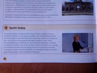 En el apartado de repaso con el título 'España hoy', además de Aguirre, se explica a los alumnos el sistema político español, la Constitución y la organización del Estado, con dos textos: uno sobre José Bonaparte (España Moderna I) y otro sobre la Guerra Civil en Madrid (España Moderna II).