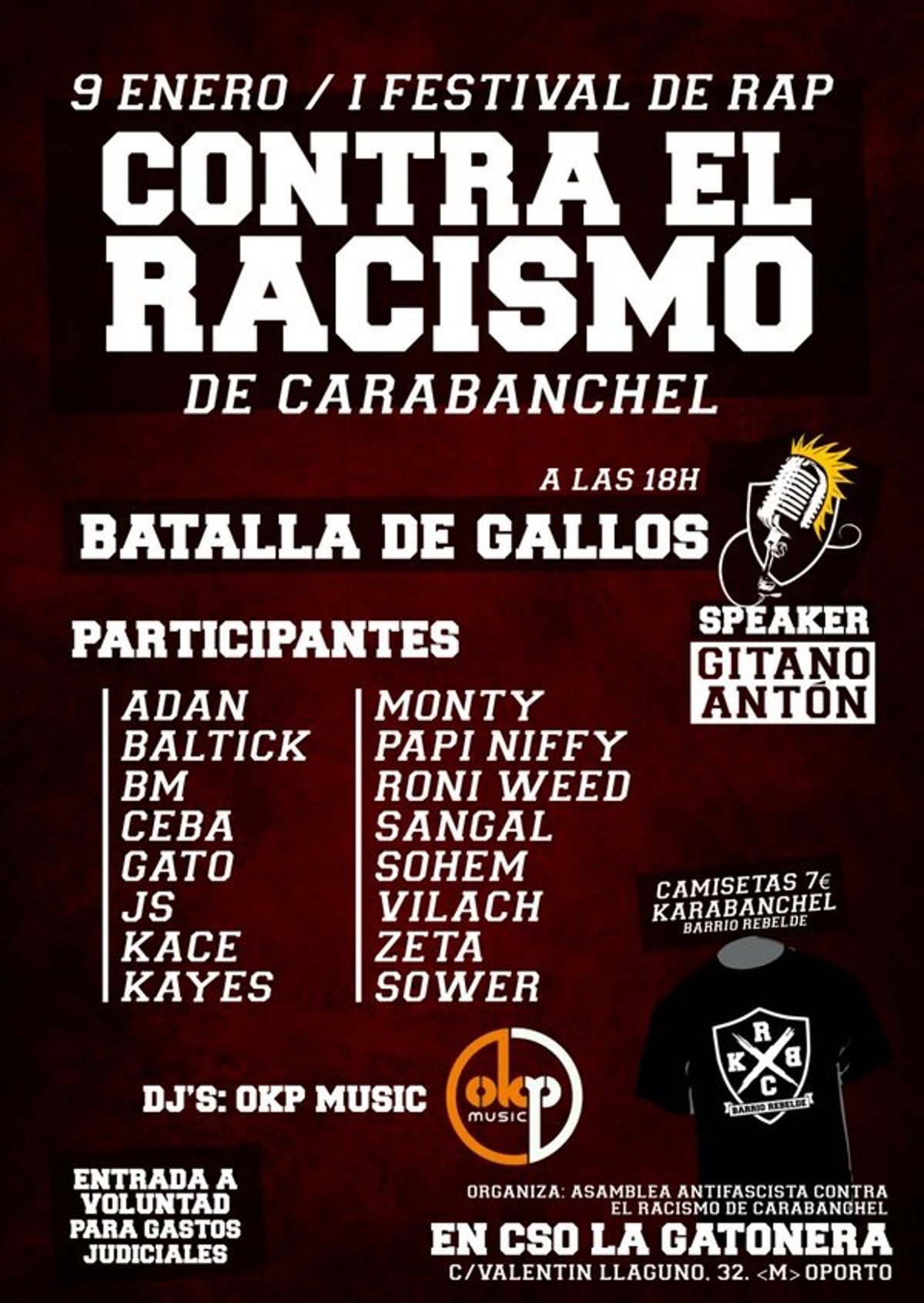 El próximo sábado, 9 de enero, el Centro Social Okupado La Gatonera acogerá el primer Festival de Rap contra el Racismo de Carabanchel, para mostrar el rechazo "a los actos xenófobos que se han producido por parte de Hogar Social Madrid y de poner en alza valores como la solidaridad, la convivencia y la diversidad cultural".