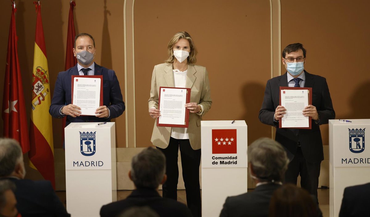 El convenio ha sido rubricado por la consejera de Medio Ambiente, Vivienda y Agricultura del Gobierno regional, Paloma Martín, con los delegados de las áreas de Desarrollo Urbano, Manuel Fuentes, y de Vivienda, Álvaro González, del Consistorio madrileño.