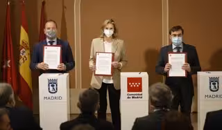 La consejera de Medio Ambiente, Vivienda y Agricultura del Gobierno regional, Paloma Martín, firma un convenio para la Cañada con los delegados de las áreas de Desarrollo Urbano, Manuel Fuentes, y de Vivienda, Álvaro González, del Consistorio madrileño. - COMUNIDAD DE MADRID