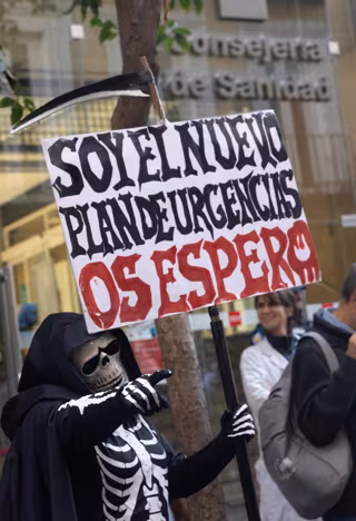 Una persona disfrazada de esqueleto con un cartel en el que se lee: 'Soy el nuevo plan de urgencias, os espero' - Eduardo Parra - Europa Press