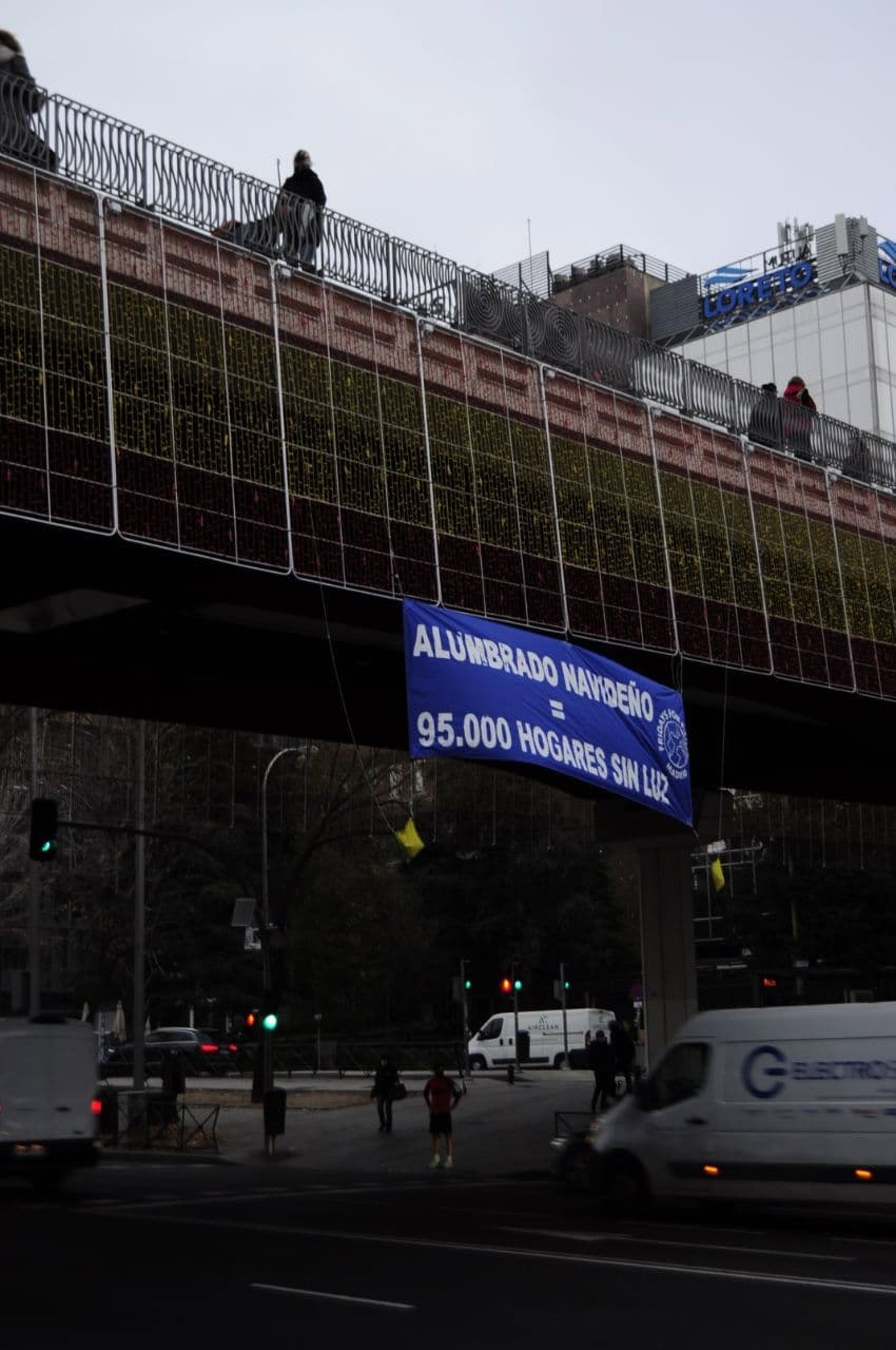 Fridays For Future Madrid (FFM) ha descolgado una pancarta, de siete metros cuadrados y con el texto 'Alumbrado navideño=95.000 hogares sin luz', en un puente de Paseo de la Castellana sobre las luces de Navidad en denuncia de la pobreza energética.