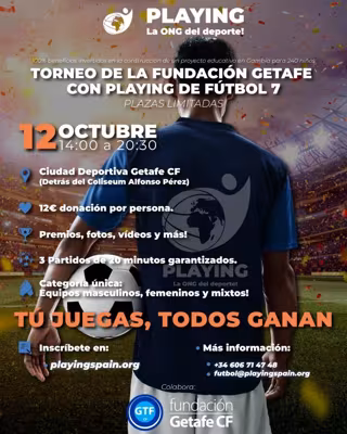 Los organizadores del torneo de fútbol 7 son los voluntarios de Playing, que han contado con el apoyo de Fundación Getafe CF que ha cedido el campo de entrenamiento del equipo madrileño de primera división para que se lleve a cabo el torneo y, además, ha asumido parte de los costes del evento.