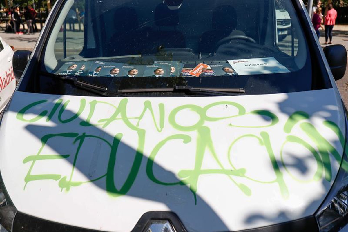 Una furgoneta de Ciudadanos ha amanecido en Madrid este viernes, último día de campaña electoral, con pintadas y su nombre tachado con la palabra Podemos por encima.