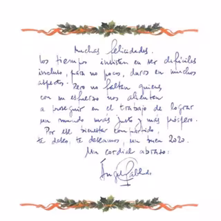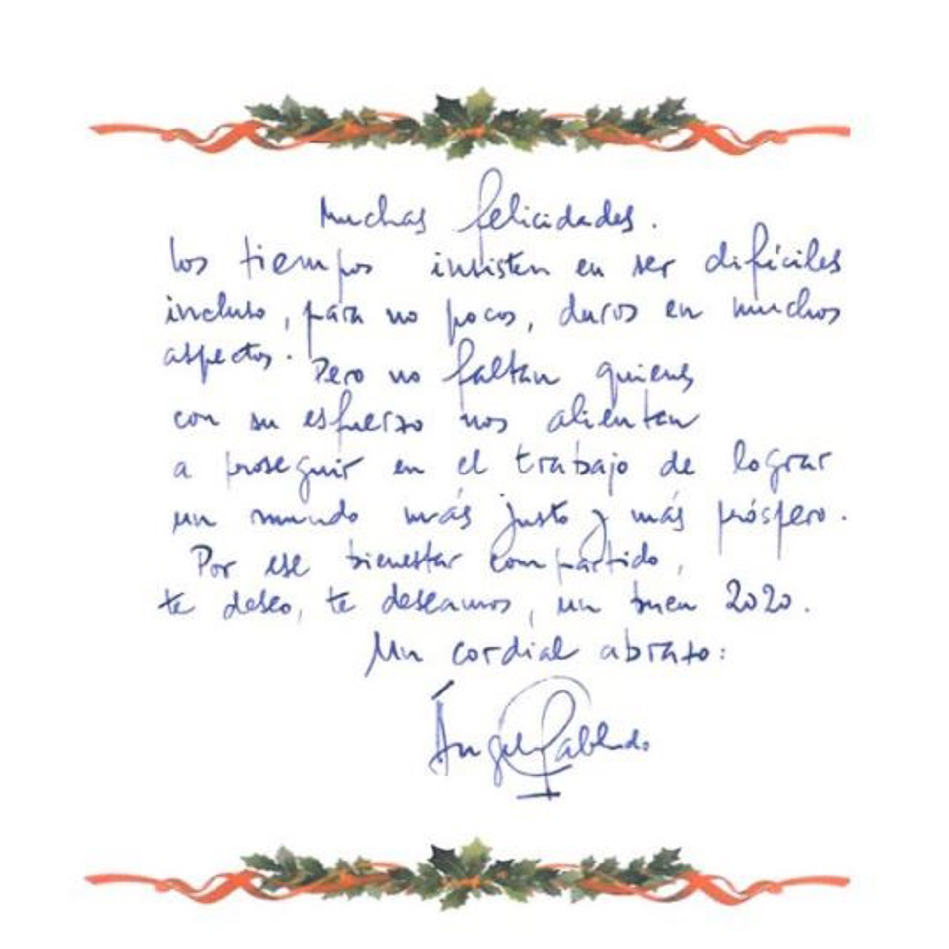 "Pero, no faltan quienes con su esfuerzo nos alientan a proser nios alientan a proseguir en el trabajo de lograr un mundo más justo y más próspero. Por ese bienestar compartido, te deseo, te deseamos, un buen 2020. Un cordial abrazo", reza la felicitación.