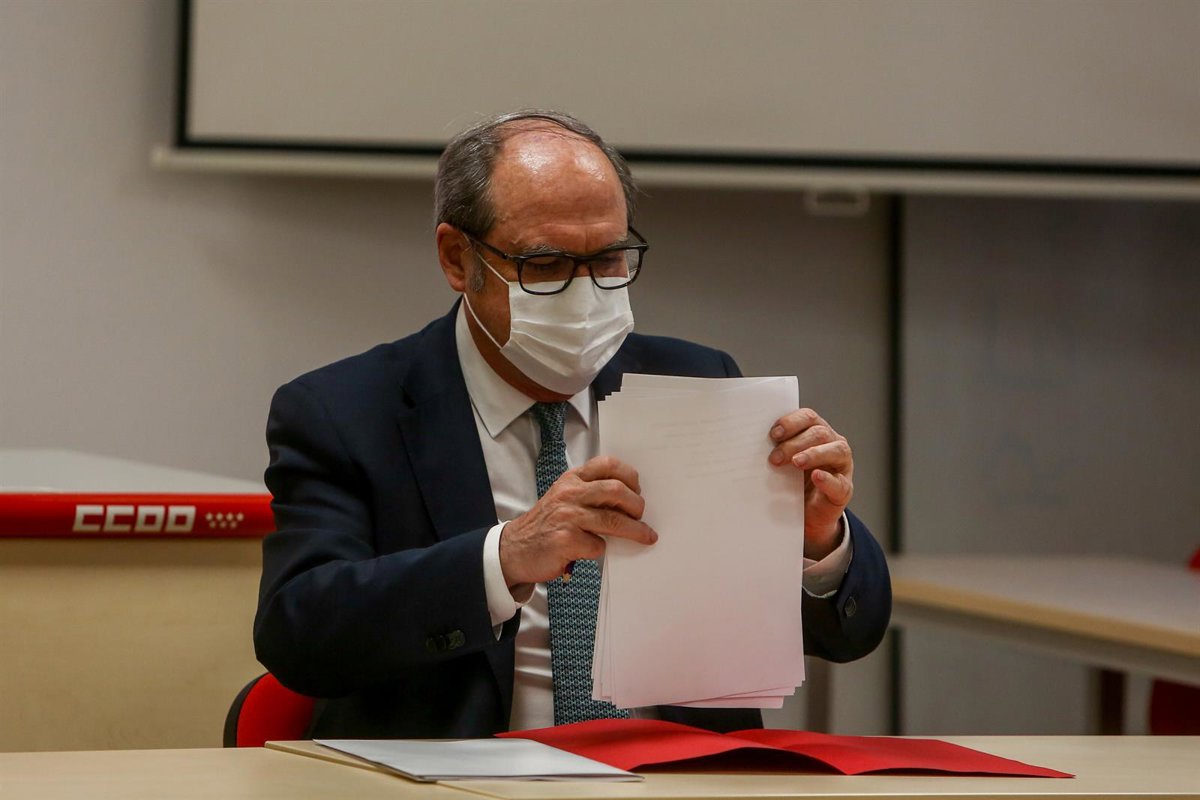 El candidato del PSOE a la Presidencia de la Comunidad de Madrid, Ángel Gabilondo, durante una reunión con una delegación de la Ejecutiva de CCOO Madrid, a 28 de abril de 2021, en Madrid (España). El candidato socialista se reúne este miércoles con CCOO - Ricardo Rubio - Europa Press
