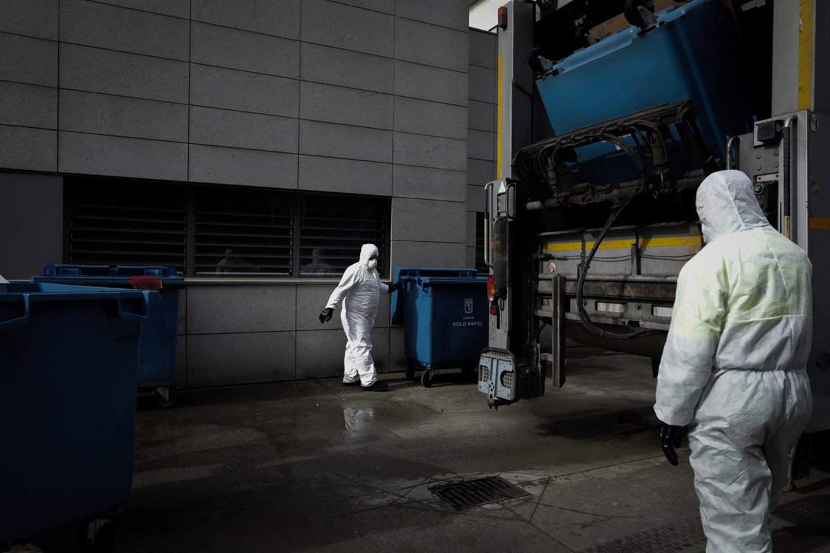 Varios trabajadores del servicio de limpieza municipal recoge residuos de pacientes con Covid-19 y los introduce en uno de los camiones de limpieza, en las inmediaciones de una Residencia de Mayores ubicada en Moratalaz. En Madrid, (España), a 16 de abr - Jesús Hellín - Europa Press