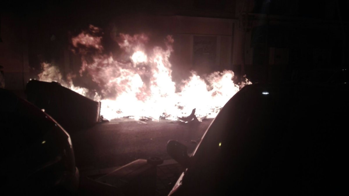 A las 00.10 horas se mantienen los 'antidistubios' en las entradas a la Plaza, que ofrece una imagen deteriorada, con los restos de contenedores quemados y adoquines arrancados de la calzada y de una obra cercana.