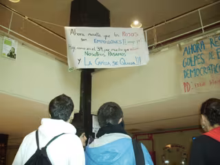 Ante esto, la UEP-ei hizo una pancarta para colocarla en el hall que decía: 'Nos han reducido el número de impresiones en el aula de informática a 10. ¿Cómo podemos seguir manteniendo una capilla si no tenemos para fotocopias? Por una universidad pública, de calidad y laica'.