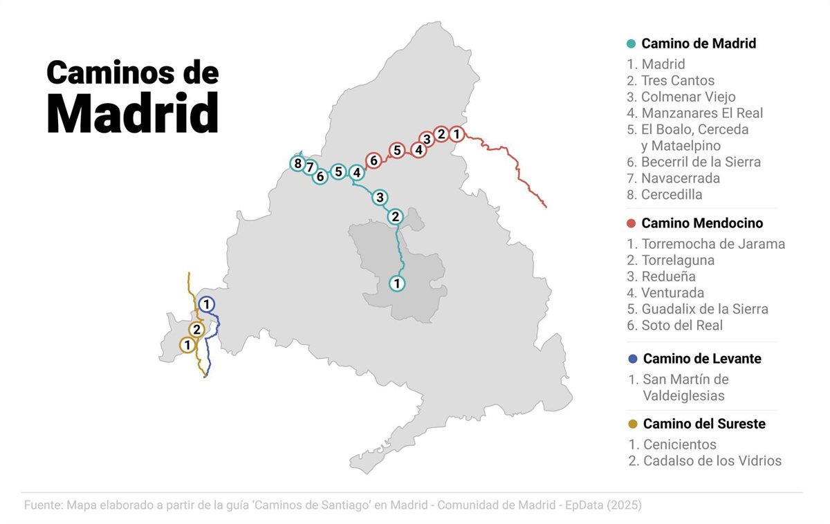 Uno de los itinerarios nace en pleno corazón de la capital. El Camino de Madrid parte desde de la Iglesia de Santiago y San Juan Bautista, en la plaza de Santiago. En este enclave, que ya figuraba en el plano de Texeira de 1656, los caminantes pueden solicitar su credencial y empezar el Camino. La ruta cruza la Sierra del Guadarrama por el Puerto de la Fuenfría (1790 m) para conectar, a través de Segovia, Valladolid y León, con el Camino Francés en Sahagún.