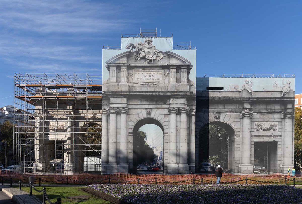 Vista de la Puerta de Alcalá el día en el que se inicia la retirada de la lona - Eduardo Parra - Europa Press