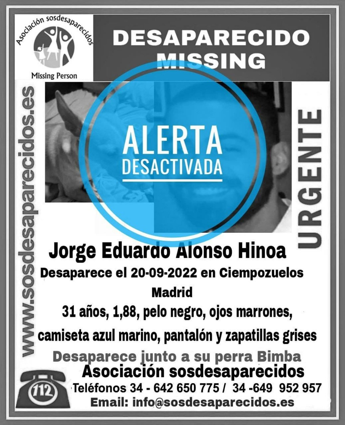 Se trata de Jorge Eduardo Alonso Hinoa, de 1,88 metros de estatura, ojos marrones y pelo negro. La última vez que se le vio fue el día 20 de septiembre. Vestía camiseta azul marino, pantalón y zapatillas grises. Desapareció junto a su perra Bimba, que también ha sido localizada y también se encuentra bien.