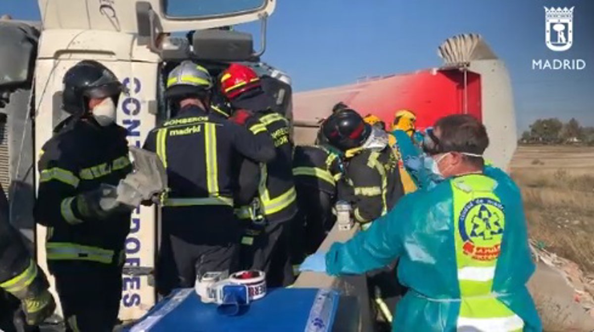 Hasta el lugar han acudido Bomberos de la Comunidad de Madrid, que tras una hora de arduos trabajos han logrado rescatar al hombre, que posteriormente ha sido atendido por los sanitarios del Samur-Protección Civil, que le han trasladado al Hospital 12 de Octubre, donde ha ingresado en estado grave. No ha habido más heridos ni vehículos implicados en el siniestro.