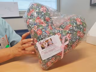 El Hospital Universitario de Fuenlabrada ha comenzado a entregar de manera gratuita las conocidas como 'Almohadas del corazón' a las pacientes operadas de cáncer de mama, que se ajusta confortablemente debajo del brazo reduciendo de manera notable el dolor de la incisión, al no presionar el edema originado por la intervención.