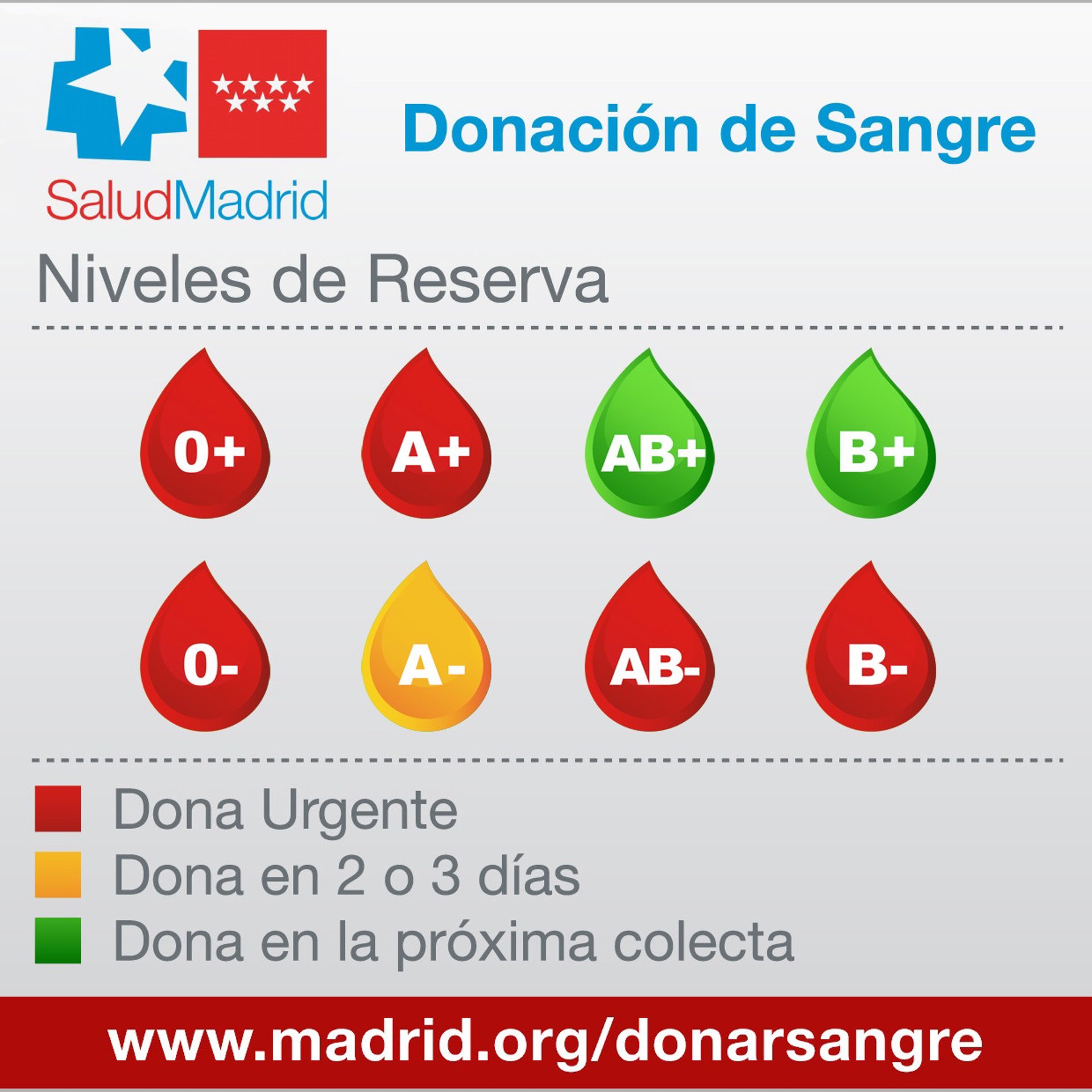 Además, según ha informado el Centro de Transfusión de Sangre de la Comunidad de Madrid, también se requieren donaciones en próximos días del grupo A-, que se sitúa en alerta amarilla.