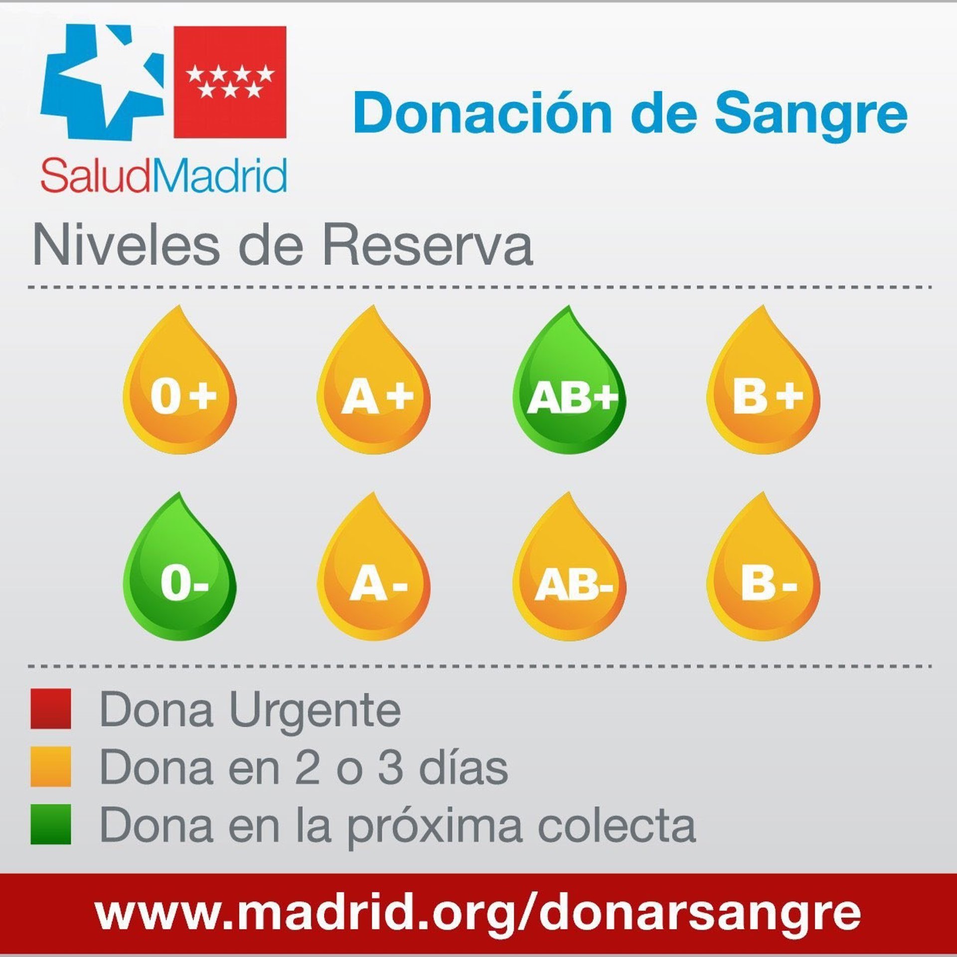El Centro de Transfusión de Sangre de la Comunidad de Madrid ha informado de que los hospitales madrileños necesitan las donaciones de los grupos sanguíneos 0+, A+, B+, A-, AB- y B-.