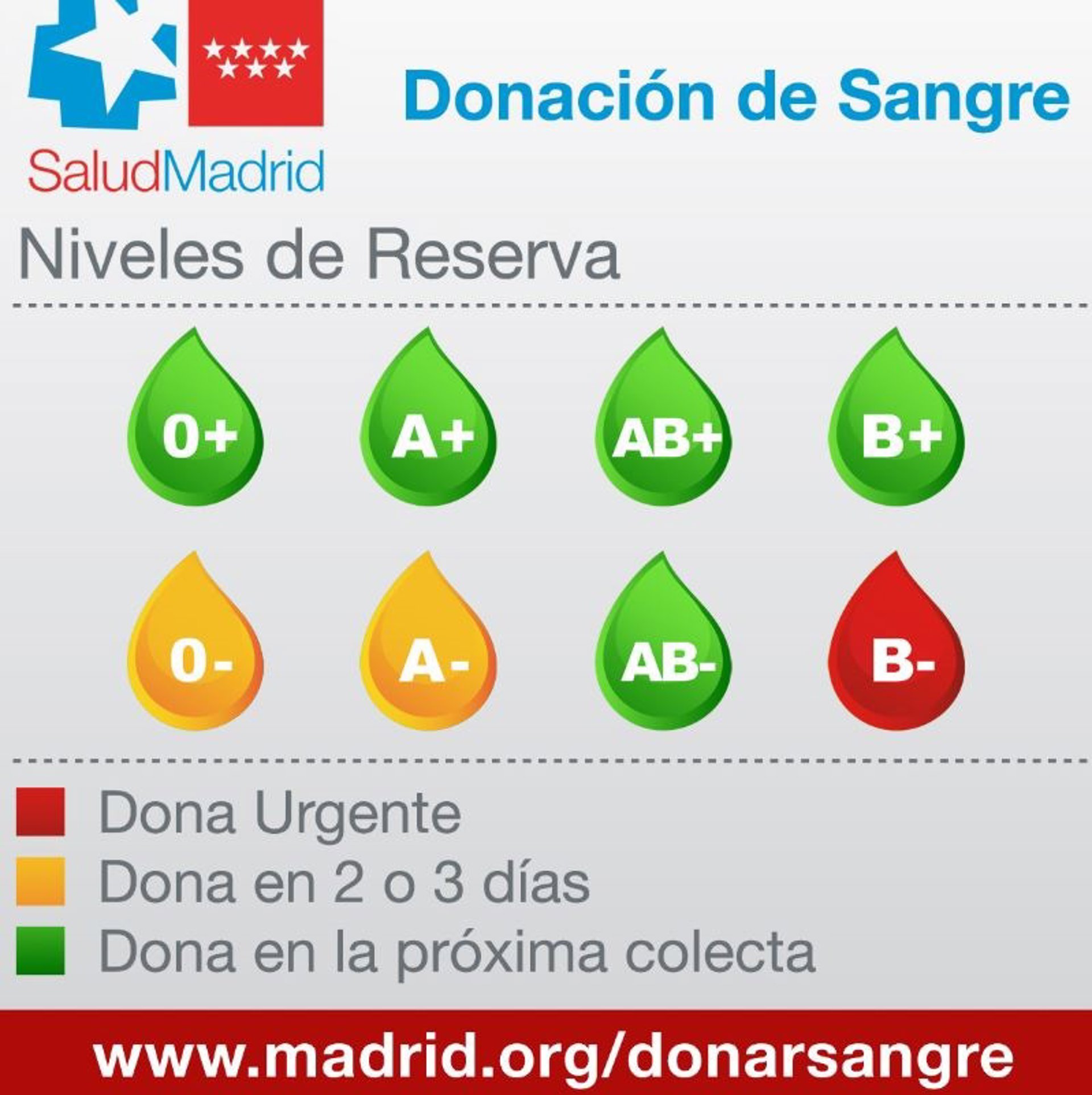 Los hospitales madrileños necesitan con urgencia sangre del grupo B-, dado que las reservas se encuentran en alerta roja, mientras que de los grupos 0- y A- se necesita sangre para los dos o tres días próximos al estar en alerta amarilla, según ha informado el Centro de Transfusión.