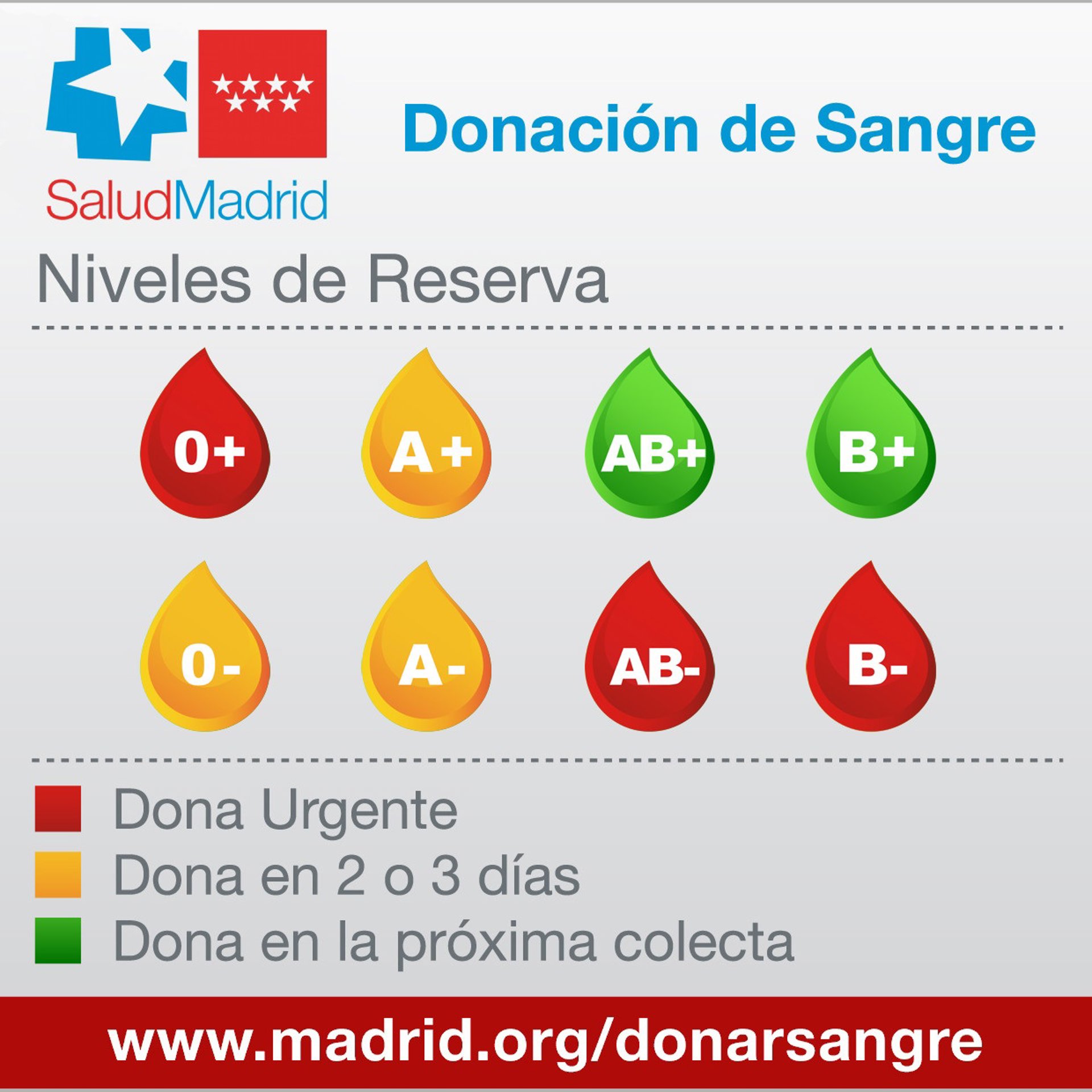Por otro lado, los grupos A+, A- y 0- están en alerta amarillo por lo que se necesitan donaciones para los próximos dos o tres días. El resto (AB+ y B+) están en verde, según detalla el organismo, por lo que se requieren ya para la próxima colecta.
