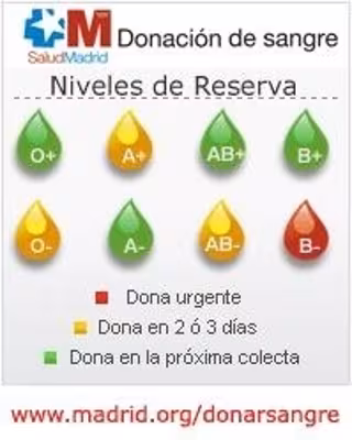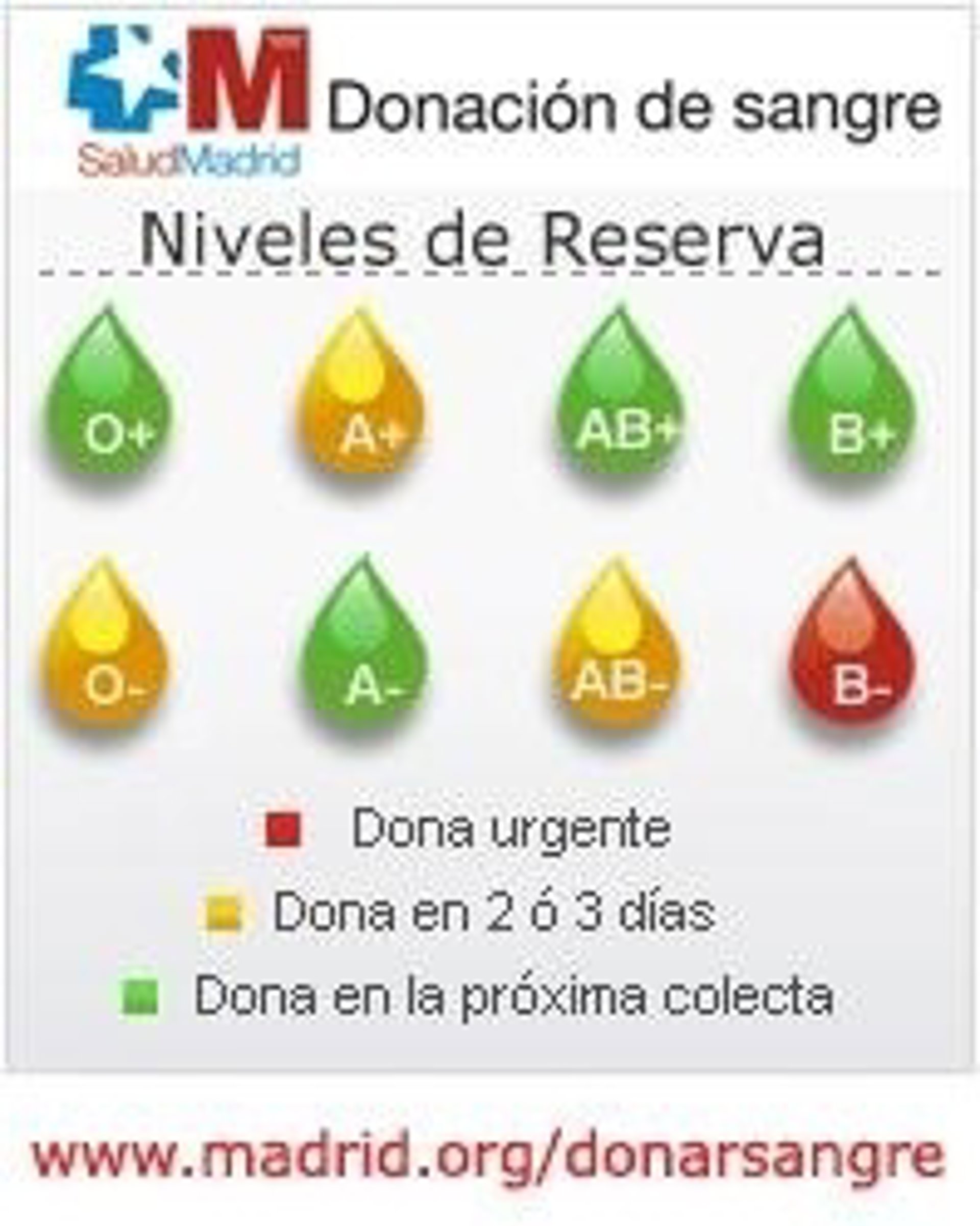 El Servicio Madrileño de Salud ha difundido este lunes los niveles de reservas de sangre, que hacen recomendables las donaciones de los grupos A+, 0- y AB- durante los próximos dos o tres días en la Comunidad de Madrid y de manera urgente el B-.