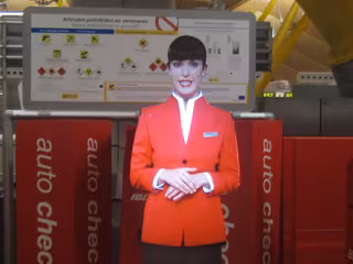 La iniciativa consiste en la instalación de dos asistentes virtuales, uno masculino y otro femenino, a través de la proyección de una grabación de imagen y sonido. Ambos, vestidos con el uniforme del personal de Iberia, están situados frente a los mostradores 810 y 811 de Iberia en la T4.