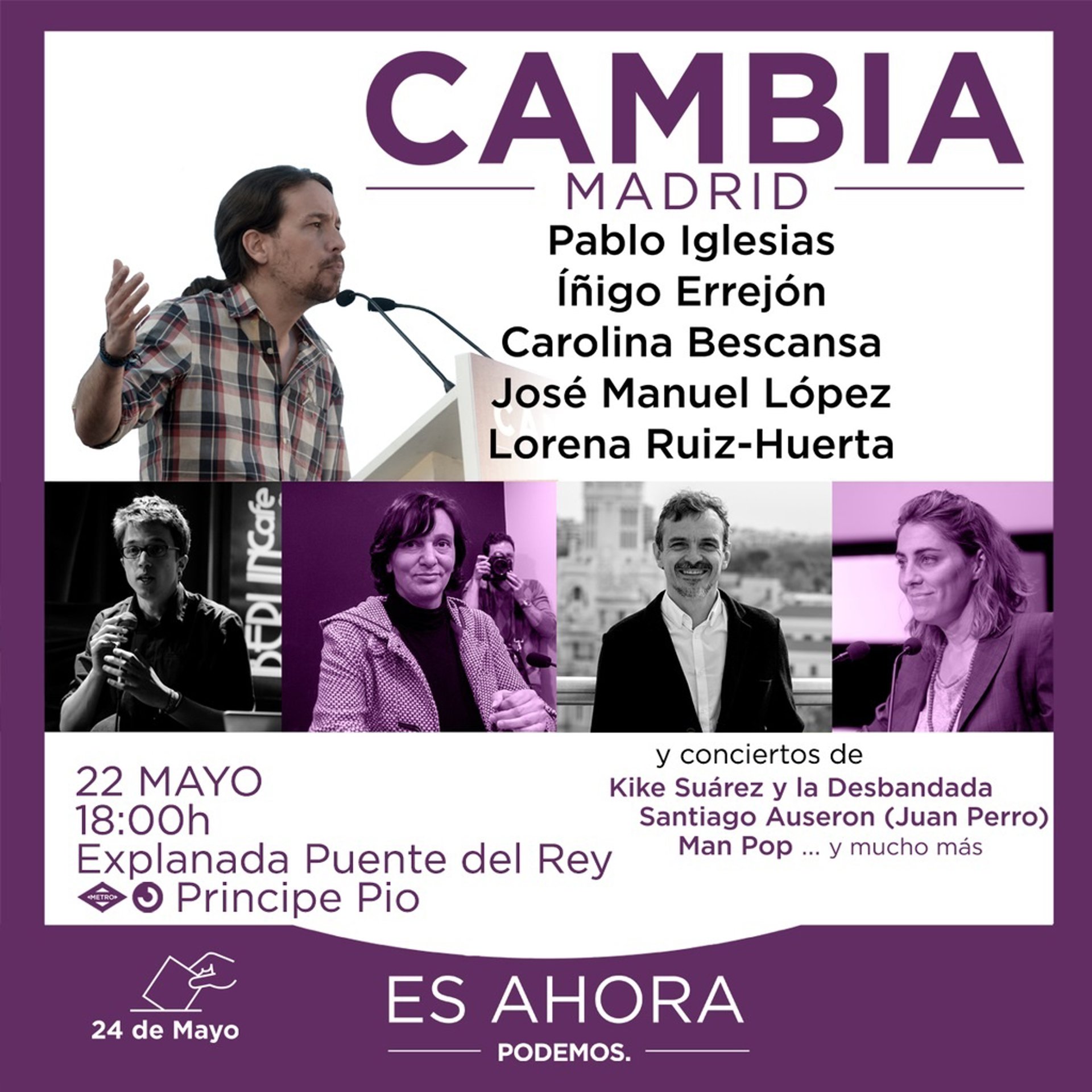 Además, habrá un mitin en el que participarán además de los anteriormente citados, la 'número dos' de Podemos a la Comunidad de Madrid, Lorena Ruiz-Huerta. Todo ello se desarrollará en la Explanada del Puente del Rey, en el Paseo de la Virgen del Puerto de la capital.
