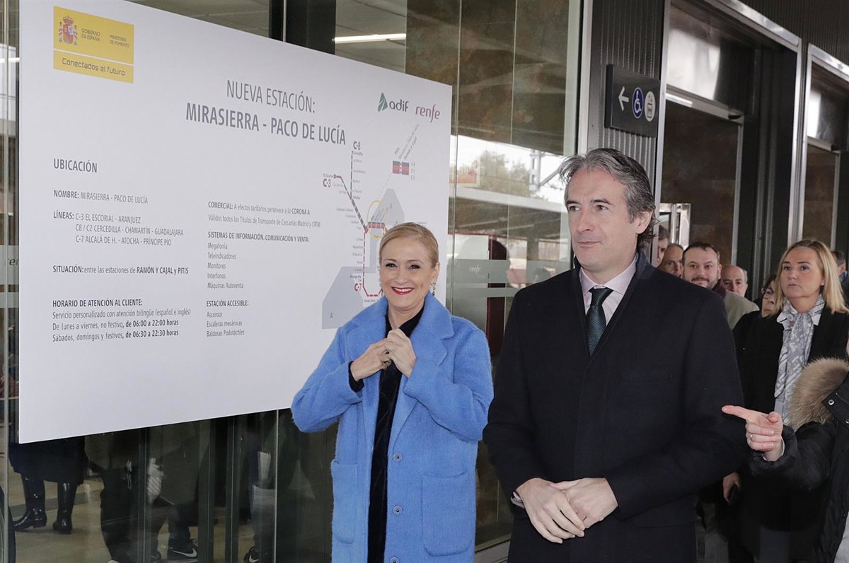 El ministro de Fomento, Íñigo de la Serna, la presidenta de la Comunidad de Madrid, Cristina Cifuentes, y la delegada de Movilidad del Ayuntamiento de Madrid, Inés Sabanés, han inaugurado este lunes la estación de Cercanías de Mirasierra-Paco de Lucía que entrará mañana mismo en funcionamiento.