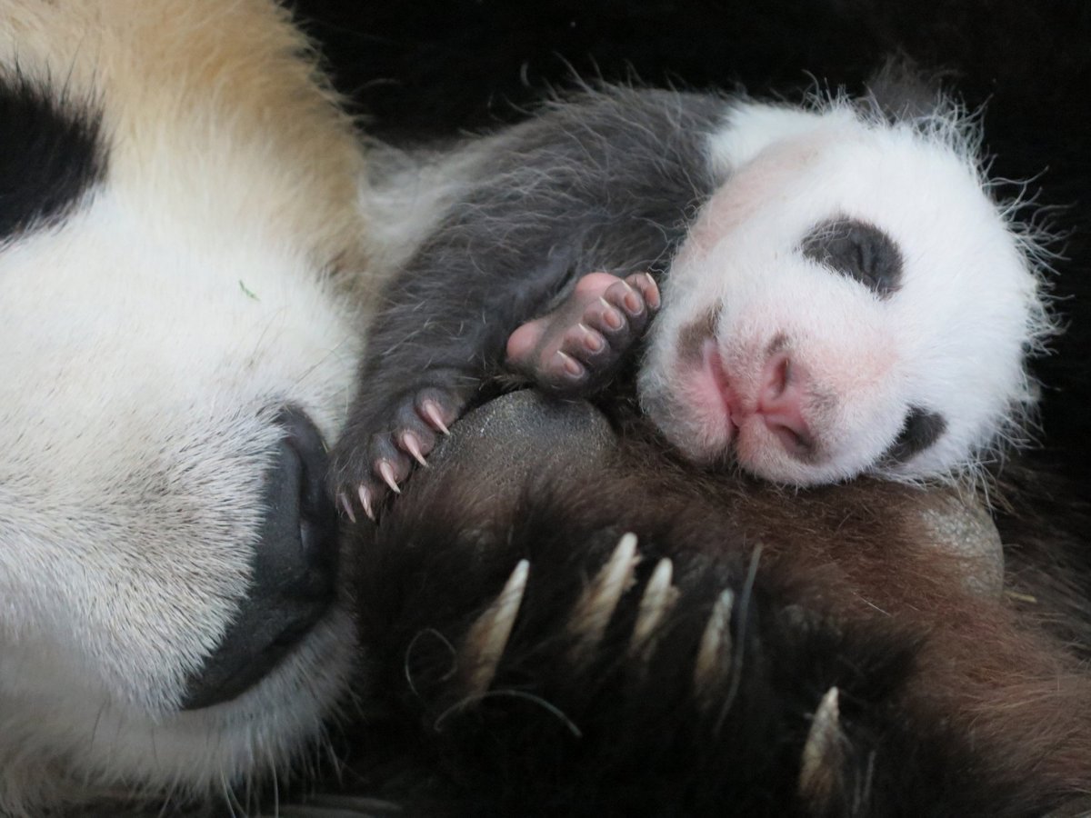 La pequeña ha experimentado una fascinante transformación en tan sólo un mes y el aspecto rosa cubierto de lanugo blanco con el que nació ha dado paso a la pigmentación típicamente panda en orejas, ojos, comisura de los labios, patas y la marca negra que les atraviesa la espalda de un lado a otro.