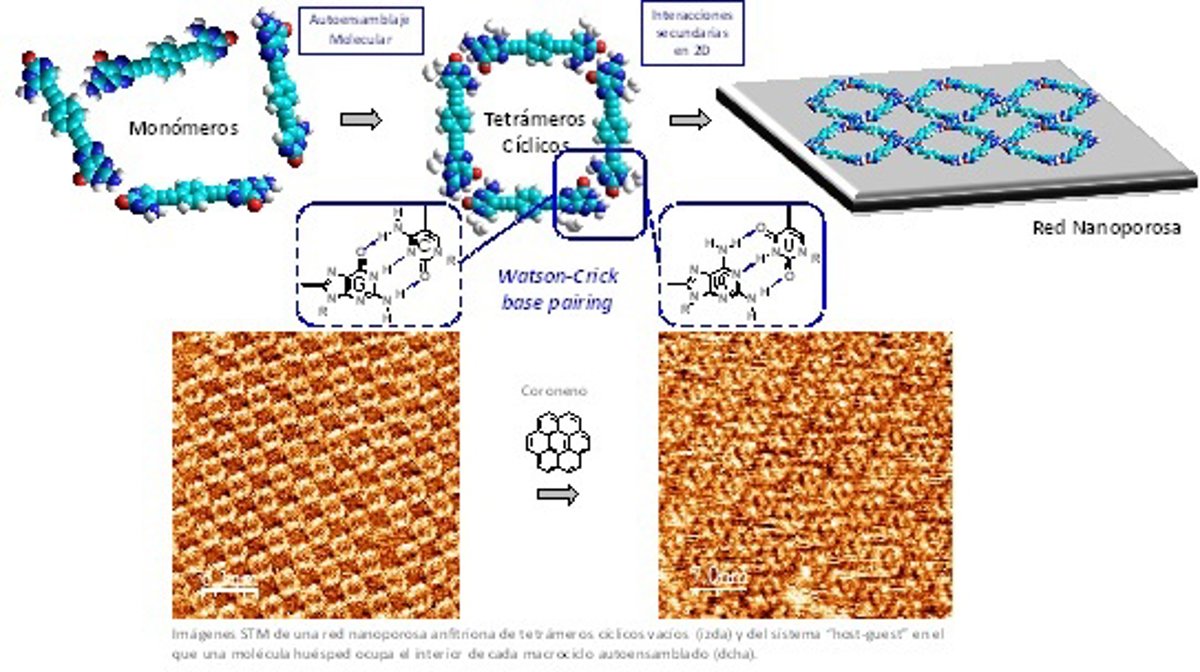 Así, los investigadores Nerea Bilbao y David González han desarrollado una estrategia "novedosa y versátil" en la que un tetrámero cíclico discreto se auto-ensambla a partir de cuatro unidades iguales (monómeros), mediante interacciones de tipo 'Watson-Crick'. Después, los tetrámeros se ordenan, formando redes porosas, guiados por la acción cooperativa de diversas interacciones secundarias: enlaces de hidrógeno, fuerzas de 'Van der Waals' e interacciones con el sustrato sólido.