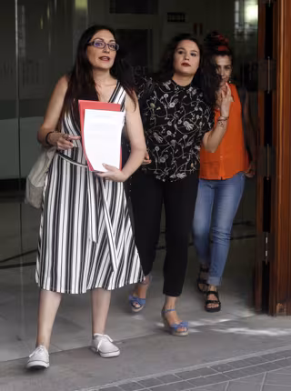 Archivo - Las diputadas de Unidas Podemos Izquierda Unida Sol Sánchez(i) y Vanessa Lillo,(d) flanquear a la portavoz de la Plataforma Afectadas Venta Vivienda EMVS, Arantxa Mejías, tras presentar en la Fiscalía General del Estado un recurso contra la s - Eduardo Parra - Europa Press - Archivo