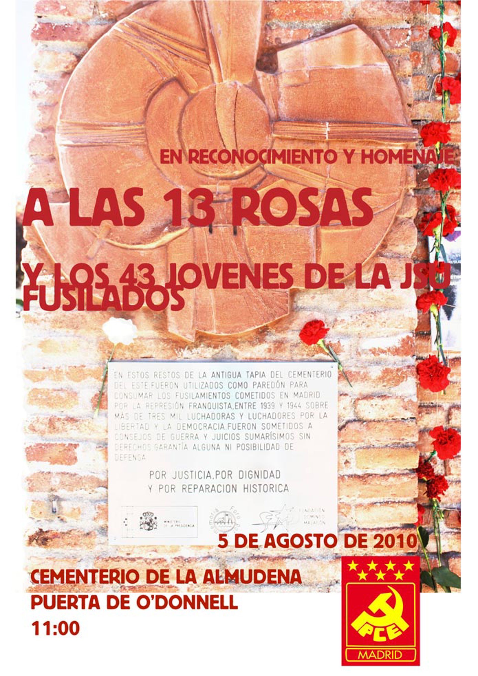 Los partidos de izquierda de Madrid, encabezados por el Partido Comunista de Madrid (PCM), han abogado por la recuperación de la Memoria Histórica para que "sea parte del acervo cultural de los españoles demócratas" durante el 71 aniversario del fusilamiento de las '13 Rosas' frente a las tapias del antiguo Cementerio del Este, hoy en día conocido como Cementerio de La Almudena.