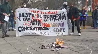 En un momento dado, algunos de ellos han dibujado un círculo en el suelo con una tiza donde han colocado uno a uno una veintena de fotos de ambos monarcas, algunas también de ellos con Franco, y les han prendido fuego, mientras han proferido gritos a favor de la libertad de expresión y "monarquía corrupta", "los Borbones, a los tribunales" o "que arda el rey".