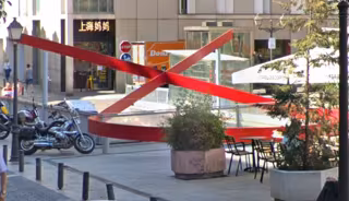 El lazo rojo que conmemora la respuesta al VIH-Sida en el Estado Español ubicado a la entrada del aparcamiento subterráneo de la Plaza Pedro Zerolo permanecerá en este enclave una vez finalicen las obras de remodelación del espacio, previstas para este verano tras finalizar el Orgullo.