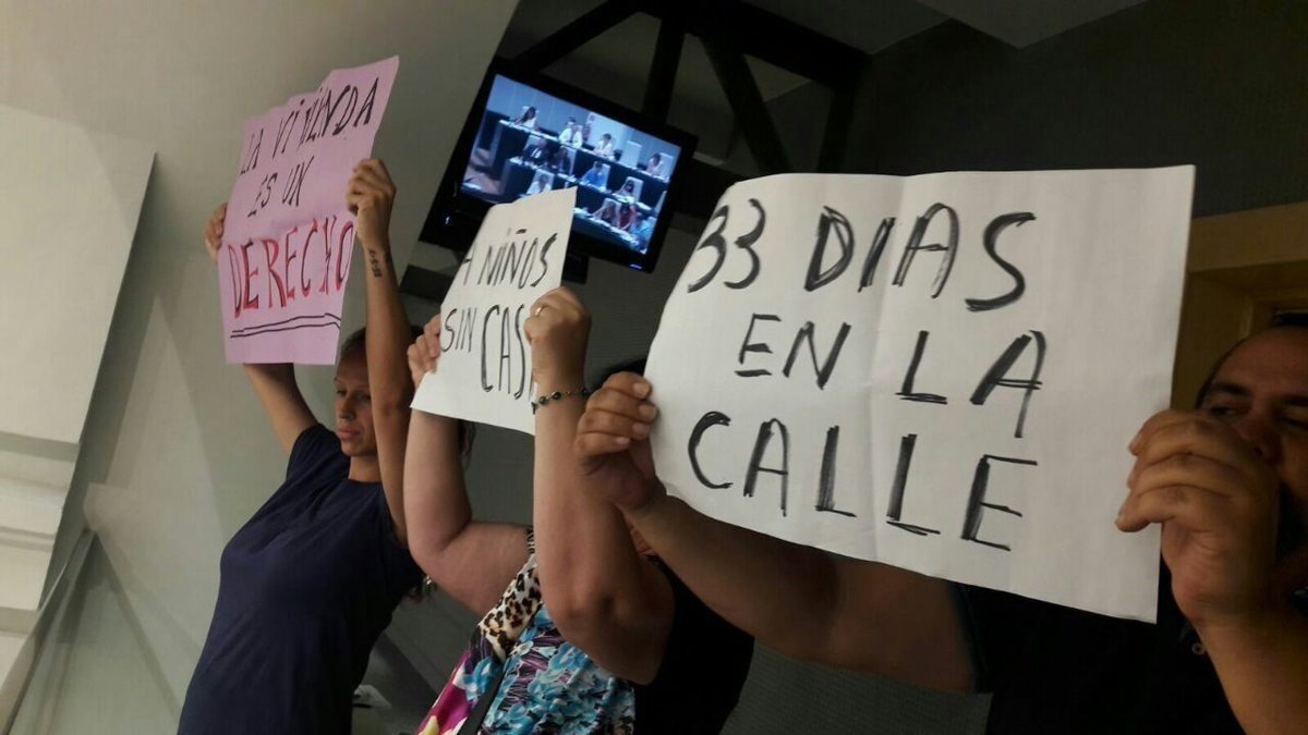 'Cuatro niños sin casa' o 'La vivienda es un derecho' han sido algunos de los lemas que han portado tanto la pareja como las personas que los acompañan en las gradas del Pleno.
