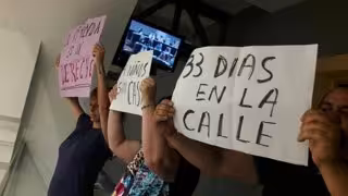 Lidia y Santi, la pareja acampada frente a la Junta de Carabanchel tras ser desahuciada, ha irrumpido de forma pacífica y silenciosa en el Pleno de Cibeles portando carteles en los que denuncian su situación tras 32 días en la calle con cuatro menores.