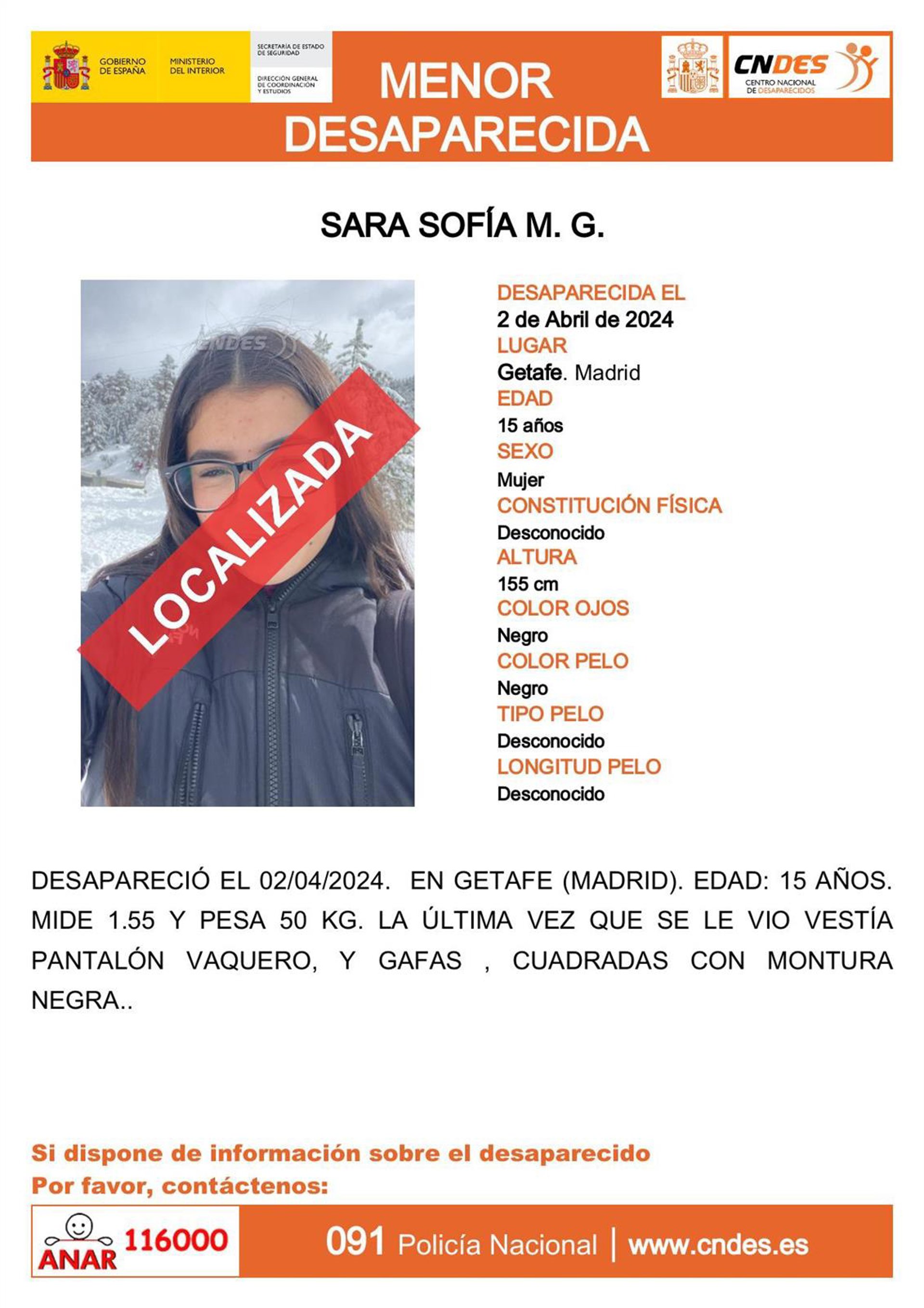 Una adolescente de 15 años de Getafe ha sido localizada en buen estado tras denunciarse su desaparición el pasado 2 de abril, según ha confirmado el Centro Nacional de Desaparecidos del Ministerio del Interior.