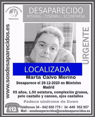 Localizada la mujer de 55 años con Síndrome de Down que estaba desaparecida y que había sido vista por última vez este martes en Móstoles.