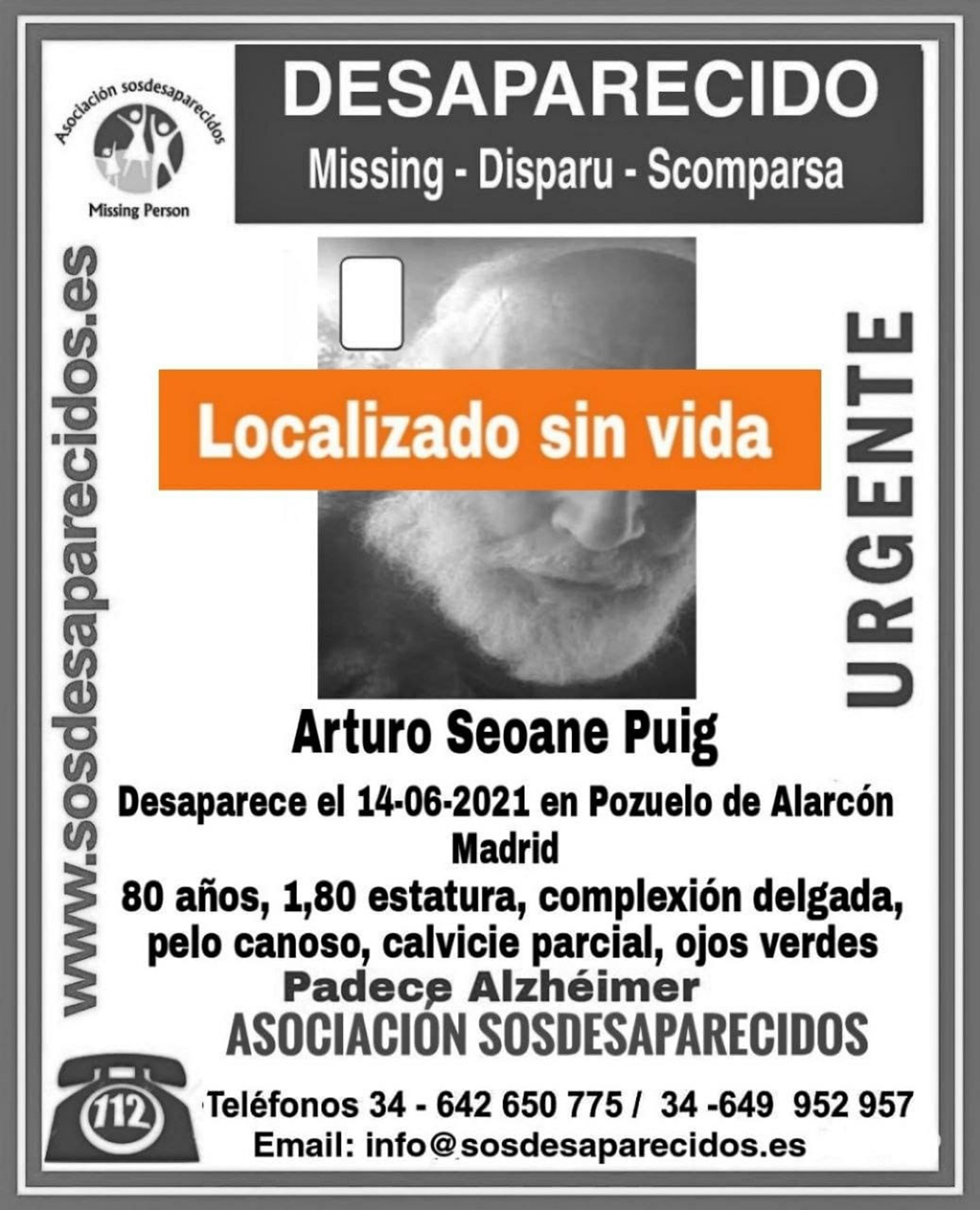 El fallecido se llama Arturo Seoane Puig, residente en Pozuelo. Su rastro se perdió el día 14 y desde entonces sus familiares denunciaron los hechos en comisaría y han intentado sin éxito encontrarle. Su caso era urgente ya que padece Alzhéimer.