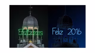 De esta forma, se han utilizado tipografías actuales, modernas y elegantes, cambiando la instantánea final de las campanadas. La tipografía elegida está inspirada en la escritura a mano, aportando un toque desenfadado y festivo al luminoso (dandelion handwriting).