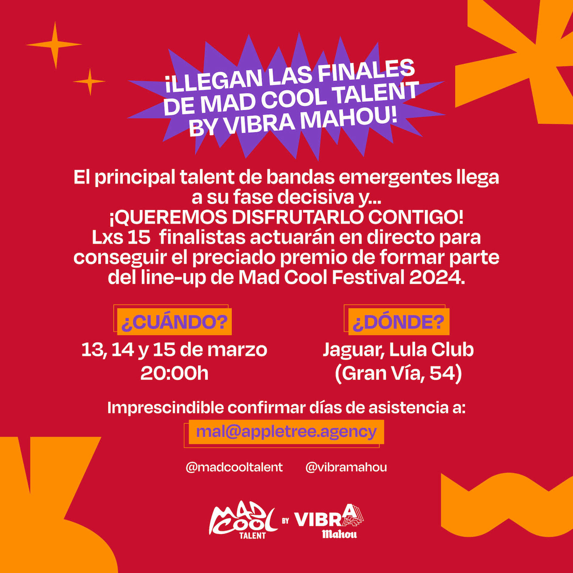 El Mad Cool Talent by Vibra Mahou arranca la última fase del concurso y presentará a los finalistas en tres finales en directo los días 13, 14 y 15 de marzo en Jaguar (Lula Club) de Madrid con entrada libre, ha informado hoy la organización en una nota de prensa.