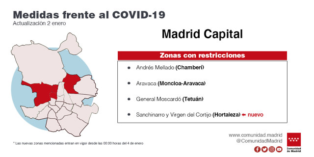Además, la Consejería de Sanidad continúa con las restricciones de movilidad, durante siete días más, es decir, hasta las 00:00 horas del lunes 11 de enero, en la ZBS de La Moraleja, en Alcobendas; en Andrés Mellado, en el distrito de Chamberí, y Sanchinarro, en Hortaleza, ambas en Madrid capital; en las zonas de Felipe II y Alcalde Bartolomé González, en Móstoles; y en la de Getafe Norte, en Getafe.