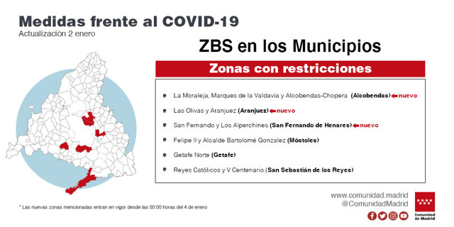 La directora general de Salud Pública ha explicado que debido al aumento de casos de coronavirus en distintos puntos de nuestra región con una tasa por encima de 400 casos por 100.000 habitantes, a partir del 4 de enero a las 00.00 horas se limita la entrada y la salida por 14 días, hasta el lunes 18 de enero a las 00.00 horas, en las zonas básicas de Marques de la Valdavia y AlcobendasChopera, en Alcobendas; Las Olivas y Aranjuez, en Aranjuez; San Fernando y Los Alperchines, en San Fernando de Henares; Virgen del Cortijo, en el distrito de Hortaleza de Madrid capital; y la zona básica de Torrelodones, que afecta a los municipios de Torrelodones y Hoyo de Manzanares.