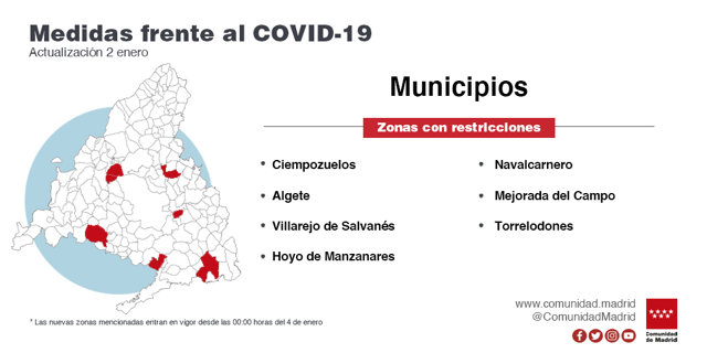 Asimismo, la Dirección General de Salud Pública establece restricciones de entrada y salida en el perímetro de cinco localidades concretas que no coinciden con el de una zona básica, por estar más localizados los focos de transmisión: Ciempozuelos, Navalcarnero, Algete, Mejorada del Campo y Villarejo de Salvanés.