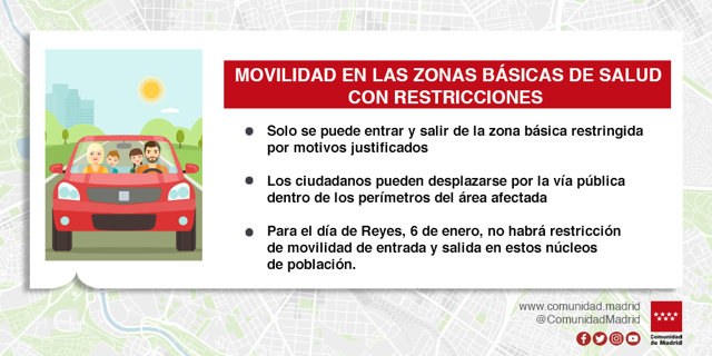 Además, está restringida la entrada y salida de la Comunidad de Madrid hasta el 6 de enero incluido, salvo para desplazamientos a domicilios de familiares y allegados.