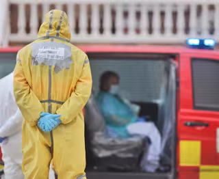 Un bombero de Leganés (Madrid) supervisa el traslado de una paciente, procedente del Hospital Universitario Severo Ochoa, al hospital de campaña habilitado en el pabellón deportivo 'Carlos Sastre' de la localidad el primer día de su funcionamiento. En L - Eduardo Parra - Europa Press