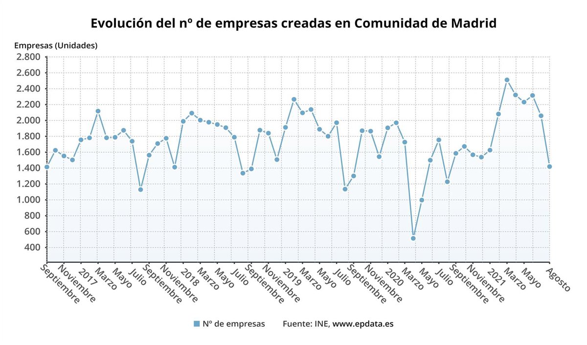 El número de nuevas sociedades mercantiles aumentó un 9,7% en agosto en relación al mismo mes de 2020, hasta totalizar 6.309 nuevas empresas, la cifra más alta en un mes de agosto desde 2016.
