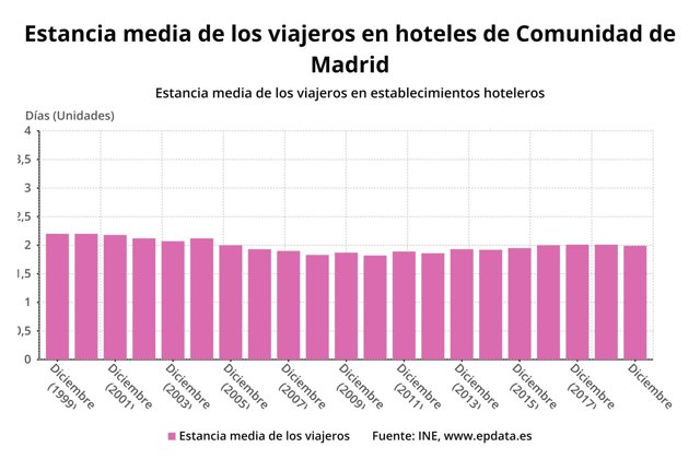 Las pernoctaciones realizadas en hoteles de la Comunidad de Madrid cerraron 2019 con un incremento del 0,96 por ciento, hasta sumar 2,01 millones, según datos difundidos hoy por el Instituto Nacional de Estadística (INE), con más de un millón de viajeros, un 1,96% más respecto al año anterior.