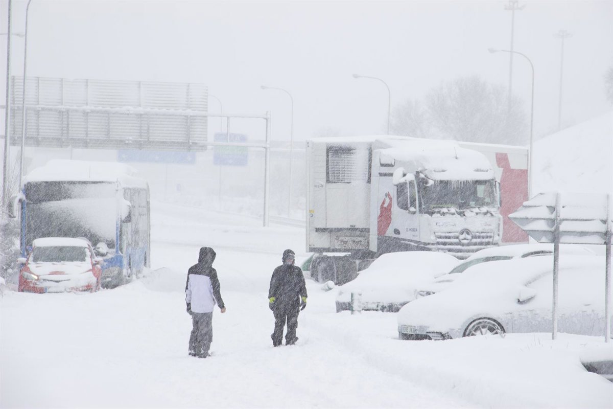 Dos personas en el que varios vehículos, entre ellos un camión y un autobús de línea municipal, han quedado atrapados en una de las carreteras de acceso al distrito de Hortaleza, en Madrid (España) a 9 de enero de 2021. - Javier González - Europa Press