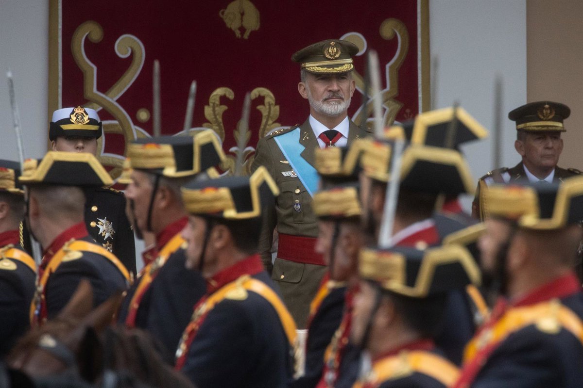 El Rey Felipe VI durante el acto solemne de homenaje a la Bandera Nacional y desfile militar por el 12 de octubre, Día de la Hispanidad, en la Plaza de Cánovas del Castillo, a 12 de octubre de 2024, en Madrid (España). - Alejandro Martínez Vélez - Europa Press